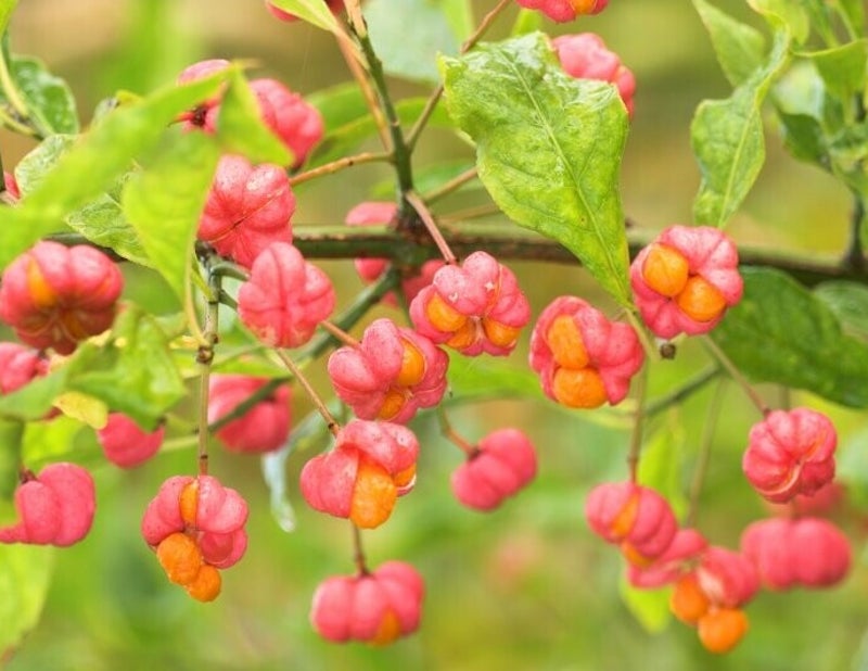 Minder gekend, maar daarom zeker niet minder mooi. Deze multifunctionele plant is in al haar gedaantes een opvallende verschijning. Liggend, klimmend of kruipend groeit kardinaalsmuts uit tot een plant met groene, ovale blaadjes die het in de winter vasthoudt. In juni en augustus staat de kardinaalsmuts in bloei met geel-groene bloempjes. Daarna wordt de struik alleen maar mooier. De roze vruchten met opvallende oranje zaden springen open en zijn tot oktober zichtbaar. De bessen zijn dus niet alleen een lust voor vogels, maar ook voor het oog.