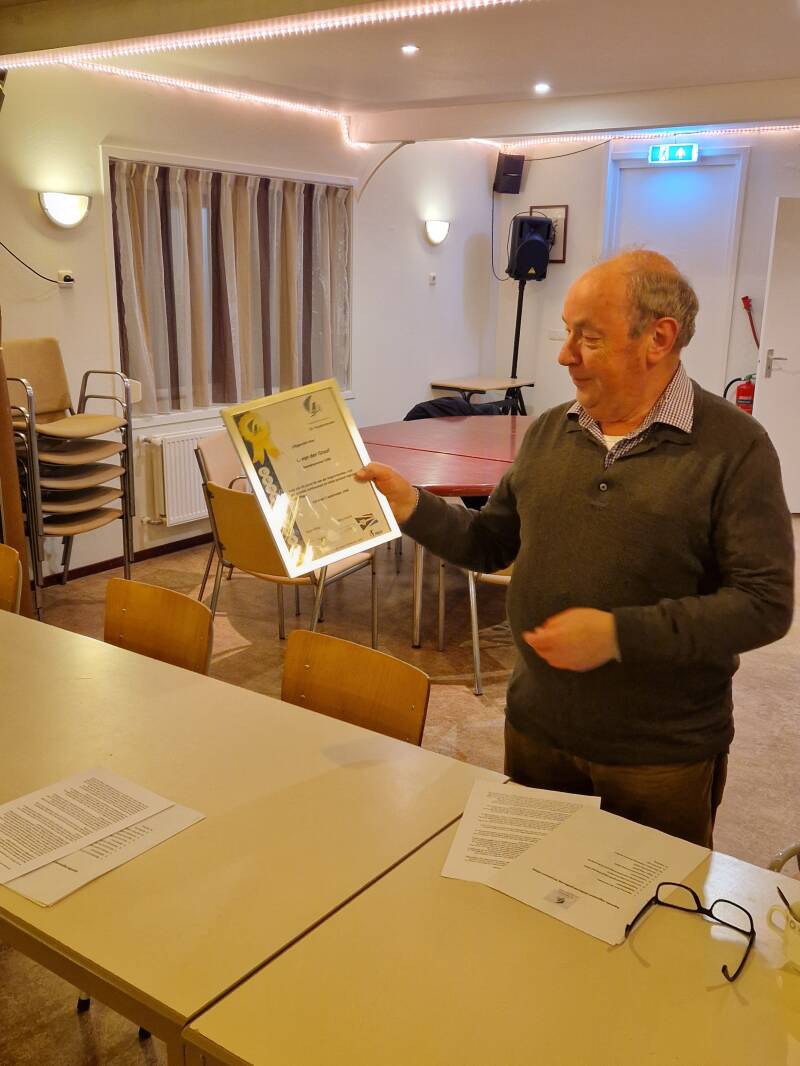 Een eervolle vermelding mochten we uitreiken aan de heer Leen vd Graaf. Al 65 jaar is de heer vd Graaf lid van onze vereniging, en heeft hierin diverse functies mogen bekleden. Tot voor kort bracht de heer vd Graaf nog maandelijks de papieren versie van de nieuwsbrief rond op de fiets. Gelukkig mogen we de heer van de Graaf nog regelmatig begroeten in het clubhuis wanneer er activiteiten zijn. Naast een mooie bos bloemen heeft de heer van de Graaf een ingelijst certificaat mogen ontvangen.